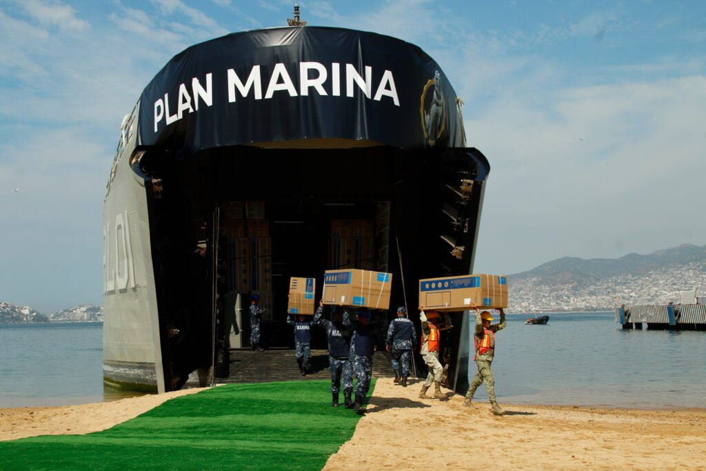 Afuera del buque BAL-01 de la Armada de México, el general Enrique Martínez López, comandante de la Novena Región Militar, mencionó que las Fuerzas Armadas mantienen en el puerto de Acapulco un centro de acopio con cinco almacenes y tres bodegas, lo que ha permitido establecer diez puntos de distribución, donde simultáneamente se reparten hasta 5 mil paquetes en un día.