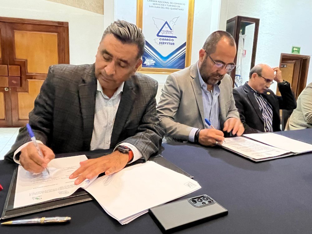 Con el propósito de promover las ventajas del Modelo de Educación Dual entre más de dos mil 900 empresas afiliadas a la Cámara Nacional de Comercio, Servicios y Turismo (CANACO SERVYTUR) de San Juan del Río, el director general del Colegio de Estudios Científicos y Tecnológicos del Estado de Querétaro (CECyTEQ), David Chaparro Aguilar, y el presidente del organismo empresarial, José Guadalupe Román Flores, firmaron un convenio de colaboración que impulsará el desarrollo académico y técnico de los jóvenes estudiantes.