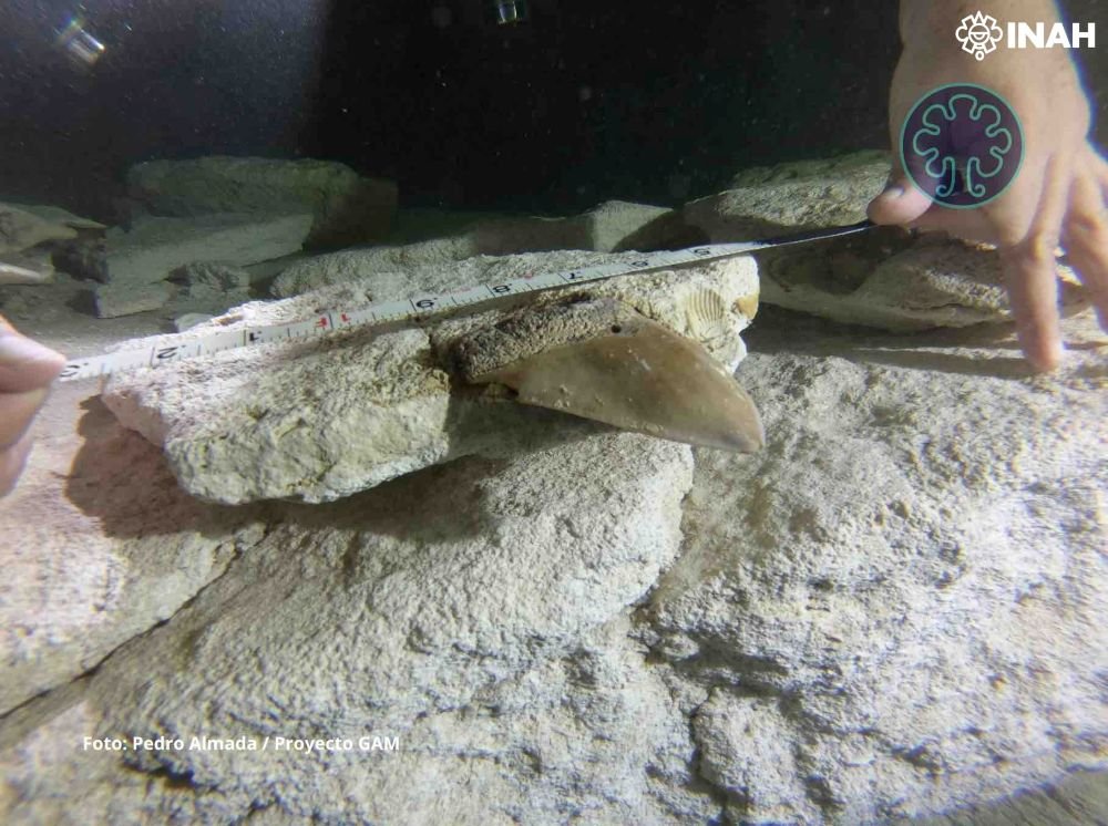 Dentro del cenote Maravilla, localizado en Puerto Morelos, Quintana Roo, a 28 metros de profundidad, en un contexto subacuático donde solo puede acceder personal especializado, el buzo de cuevas inundadas Juan Cardona descubrió, en 2019, un par de dientes de tiburón Otodus (Megaselachus) megalodón, el mayor depredador acuático de la prehistoria.