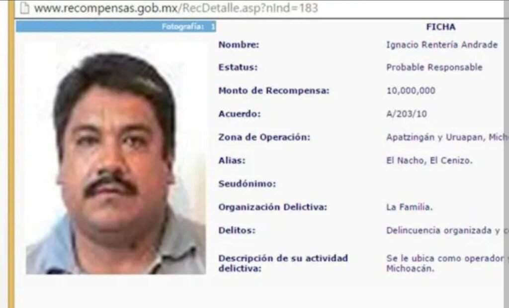 Se trata de Ignacio Andrade Rentería, alias “El Cenizo”, a quien se le atribuyó ser jefe de plaza del cártel La Familia Michoacana, organización delictiva que opera en territorio uruapense, responsable de secuestro y delitos contra la salud.