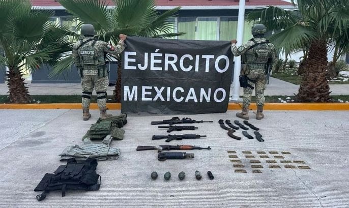 En Guadalupe, se aseguraron seis armas largas, un arma corta, 57 cargadores, 1,800 cartuchos, dos bolsas con marihuana, siete chalecos tácticos, 12 placas balísticas, una fornitura, dos cascos balísticos, 19 uniformes tácticos y un vehículo.