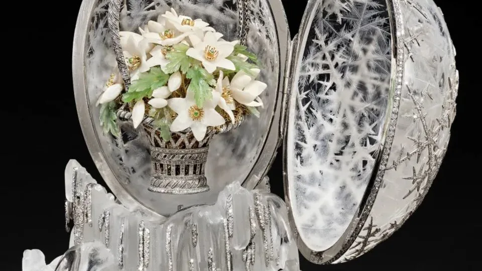 Tallado en cuarzo transparente, grabado con copos de nieve y engarzado con cerca de 4,500 diminutos diamantes, el Huevo de Invierno es considerado por especialistas como la obra maestra absoluta de Fabergé. Su aspecto, que simula escarcha cristalizada, lo vuelve un objeto único incluso entre los 50 huevos creados entre 1885 y 1916 para los zares Alejandro III y Nicolás II.