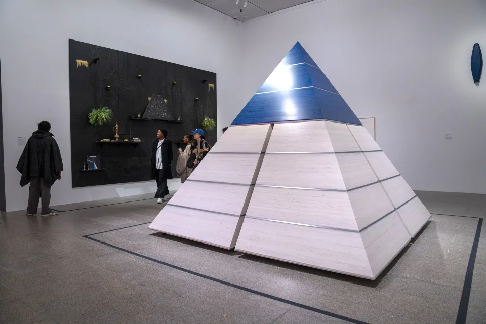 La exposición indaga en la influencia de Egipto en el arte abstracto: así, la sala ‘Nu nile abstraction’ dispone una serie de pinturas y esculturas en torno a una gran pirámide en el centro de colores azul y blanco, hecha por Rashid Johnson con materiales como jabón negro, cera, vinilo latón, libros y madera, entre otros.