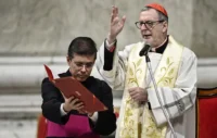 Cientos de personas se congregaron el sábado por sexta noche consecutiva para rezar un rosario por la salud del papa. A diferencia de los días anteriores, la lluvia desplazó este “maratón” de oración del plaza de San Pedro al interior de la monumental basílica homónima.