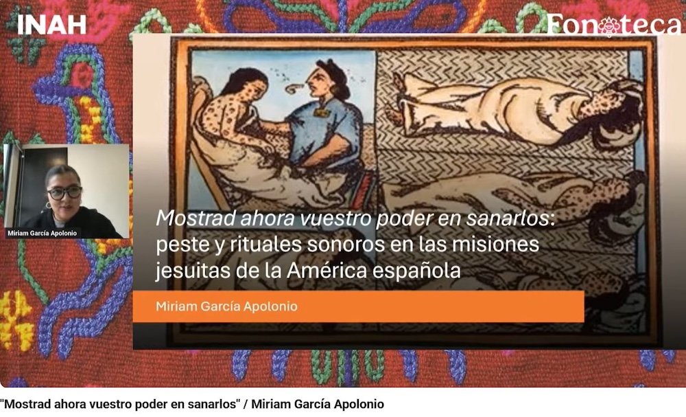 En la conferencia “Mostrad ahora vuestro poder en sanarlos”: peste y rituales sonoros en las misiones jesuitas en la América española, la investigadora de El Colegio de México, Miriam García Apolonio, analizó las reacciones de las poblaciones originarias en torno a las epidemias y las medidas que tomaban para evitarlas, dado que, bajo la lógica de los misioneros, tales afecciones eran la respuesta de Dios hacia la idolatría y las conductas concupiscentes.