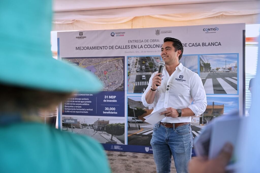 El presidente municipal de Querétaro, Felifer Macías, acompañó al gobernador del estado, Mauricio Kuri, en la entrega de las obras de mejoramiento de diversas calles en la colonia Lomas de Casa Blanca, con una inversión estatal de 31.1 millones de pesos. A este monto se suman 30 millones de pesos adicionales por parte del Municipio de Querétaro para obras en las inmediaciones del mercado y otras vialidades de la zona.