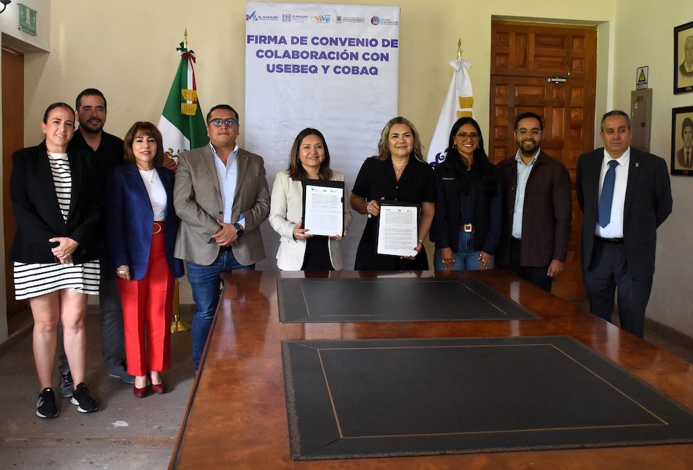 La coordinadora general de la Unidad de Servicios para la Educación Básica en el Estado de Querétaro (USEBEQ), Irene Quintanar Mejía; la coordinadora de gabinete del municipio de El Marqués, Claudia Martínez Guevara y la directora de vinculación del Colegio de Bachilleres del Estado de Querétaro (COBAQ), Wendy Mariana Sánchez González firmaron un convenio con la intención de desarrollar en los planteles educativos de aquella demarcación, acciones para la atención a la salud mental de niños, niñas, adolescentes y jóvenes.
