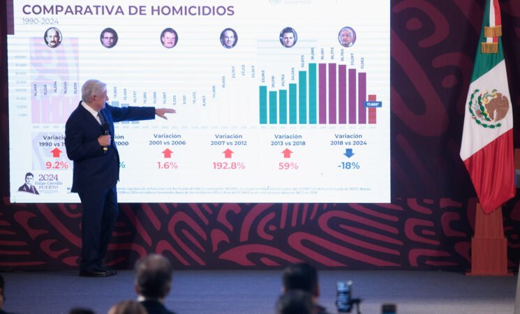 En el sexenio se logró la reducción en 19 por ciento de los homicidios dolosos, en contraste con las administraciones de Felipe Calderón (2006-2012) y Enrique Peña Nieto (2012-2018), que registraron una tendencia al alza en la incidencia delictiva.