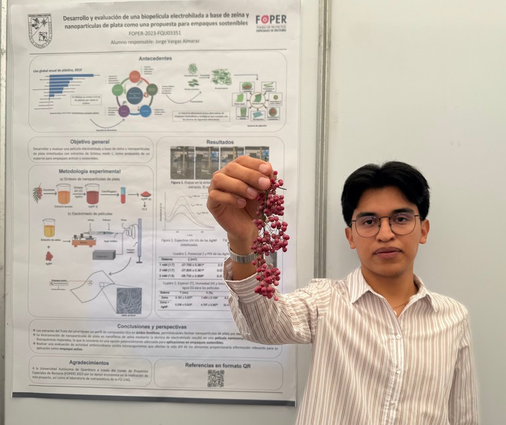 Con el apoyo del Fondo de Proyectos Especiales de Rectoría (Foper) de la Universidad Autónoma de Querétaro (UAQ), el estudiante de la maestría en Ciencia y Tecnología de Alimentos de la Facultad de Química (FQ), Jorge Vargas Almaraz, desarrolló una película biodegradable para su potencial utilización en el empaquetado de alimentos, con el objetivo de disminuir el impacto ambiental de los plásticos en la naturaleza.