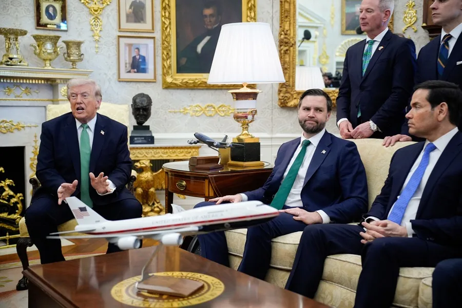 El vicepresidente JD Vance (i) y el secretario de Estado estadounidense, Marco Rubio (d), durante una reunión entre el presidente estadounidense, Donald Trump, y el Taoiseach de Irlanda, Micheal Martin, en la Oficina Oval de la Casa Blanca en Washington, DC, EE.UU., el 17 de marzo de 2026. EFE/EPA/Yuri Gripas