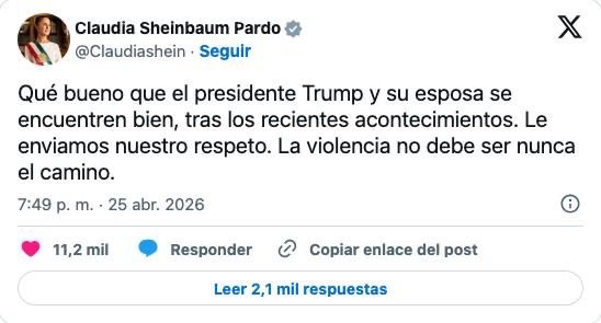 “La violencia no debe ser nunca el camino”, así lo dijo la presidenta Claudia Sheinbaum Pardo al pronunciarse este sábado por el incidente de seguridad en Washington D. C. durante la Cena de Corresponsales de la Casa Blanca, encabezado por el presidente de Estados Unidos, Donald Trump, y su esposa Melania Trump.