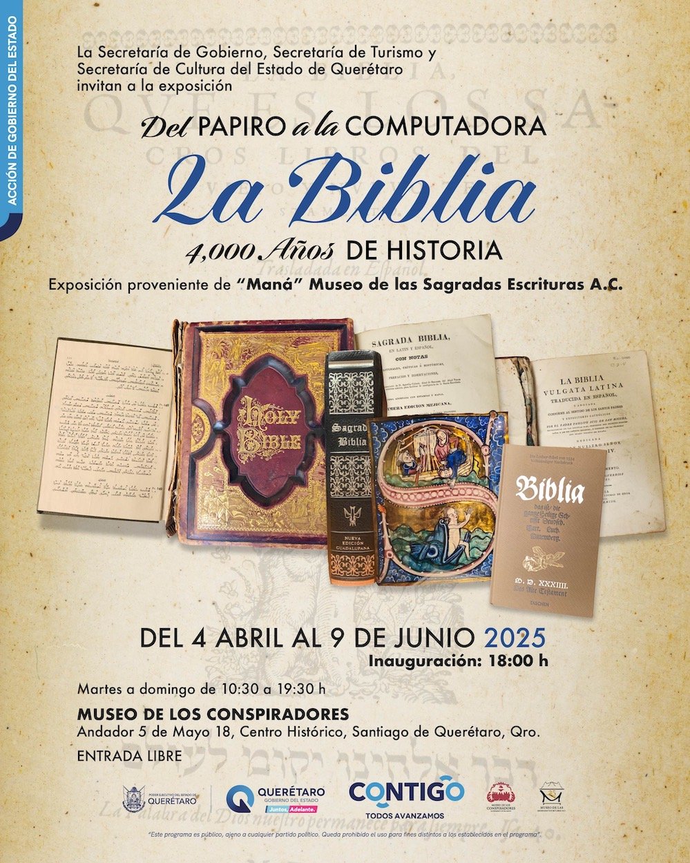 “Del papiro a la computadora: la Biblia, 4,000 años de historia”, podrá visitarse, con acceso libre, de martes a domingo, de 10:30 a 18:30 horas; el Museo de los Conspiradores se ubica en la calle 5 de Mayo, número 18, en el Centro Histórico de la capital queretana.
