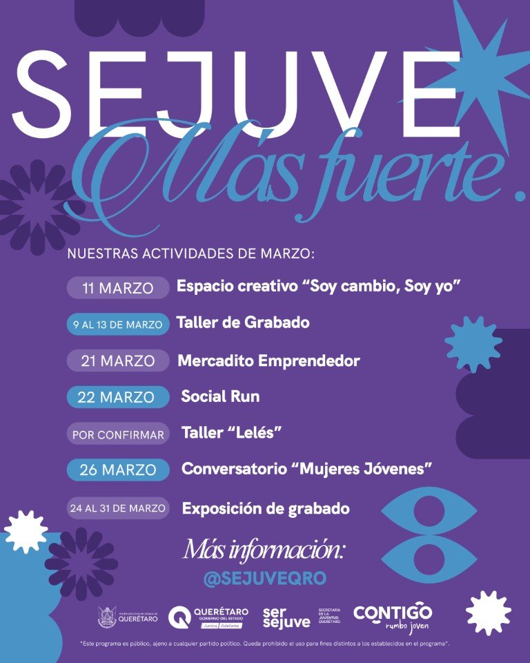 La programación cerrará con la Exposición de Grabado del 24 al 31 de marzo, donde van a exhibirse las obras creadas en el taller, y el Conversatorio Mujeres Jóvenes el 26 de marzo en las instalaciones de la SEJUVE, un espacio de diálogo con líderes y especialistas para reflexionar sobre salud mental, participación y liderazgo de las mujeres jóvenes. Las interesadas en participar pueden consultar el programa completo, fechas y sedes en las redes sociales oficiales de la Secretaría: @sejuveqro.