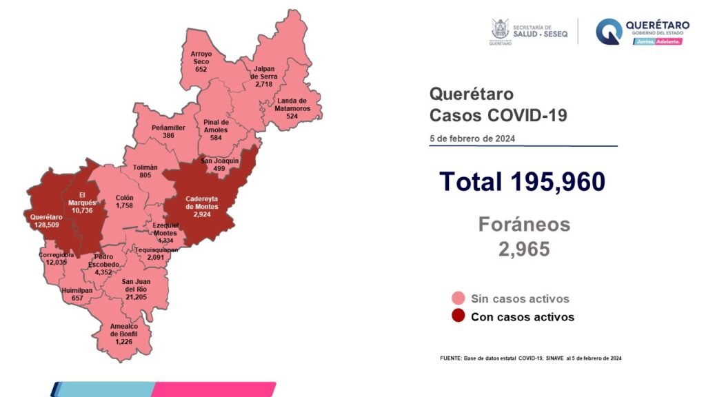 La Secretaría de Salud de Querétaro reportó este lunes cero defunciones por COVID-19 y que en los últimos siete días se han sumado 40 casos de la enfermedad en el estado; se trata de 22 mujeres y 18 hombres. El registro acumulado es de 195 mil 960 casos; 54 por ciento son mujeres y 46 por ciento son hombres.