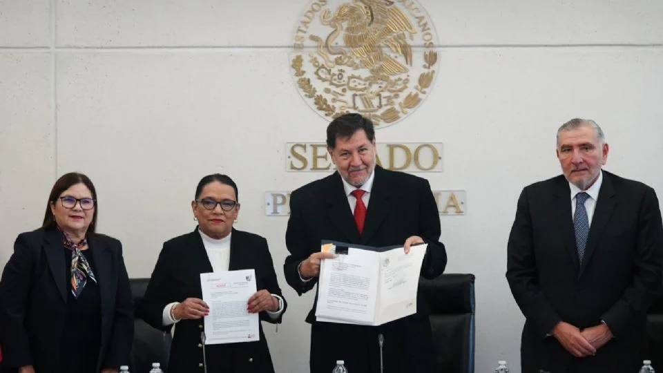 La secretaria de Gobernación, Rosa Icela Rodríguez, entregó al Senado de la República el paquete de iniciativas reglamentarias de la reforma judicial, que establece los procedimientos para que el INE realice la elección de jueces, ministros y magistrados.