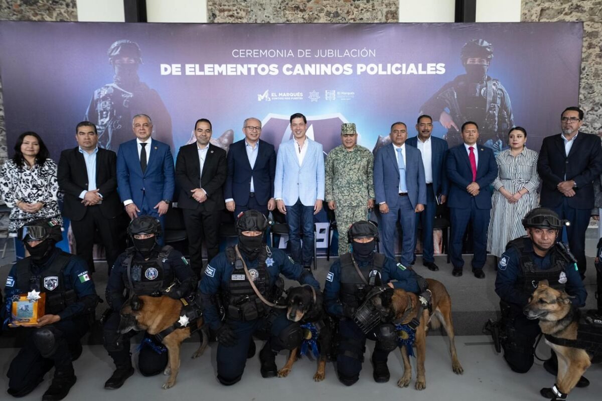 En un acto solemne, el presidente municipal de El Marqués, Rodrigo Monsalvo Castelán, encabezó la ceremonia de jubilación de tres elementos caninos policiales y el homenaje póstumo a un cuarto ejemplar, que formaron parte de la Unidad K9 de la Secretaría de Seguridad Pública Municipal (SSPM).