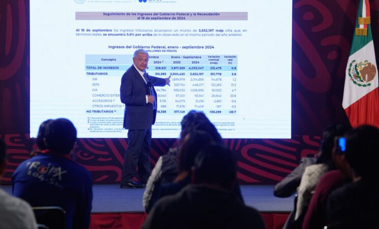 El mandatario refirió que el Gobierno de México, a pesar de la pandemia, ha mantenido una tendencia al alza en la recaudación tributaria entre 2019 y 2024, debido a la cancelación de condonaciones de impuestos luego de la reforma al artículo 28 constitucional.