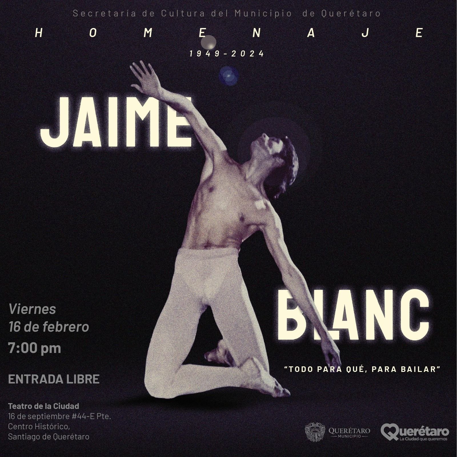 El homenaje se llevará a cabo este viernes 16 de febrero a las 7:00 pm en el Teatro de la Ciudad, donde se enaltece el gran legado que dejo el Mtro. Jaime Blanc en la danza contemporánea no sólo en nuestra ciudad, sino en México y el mundo.