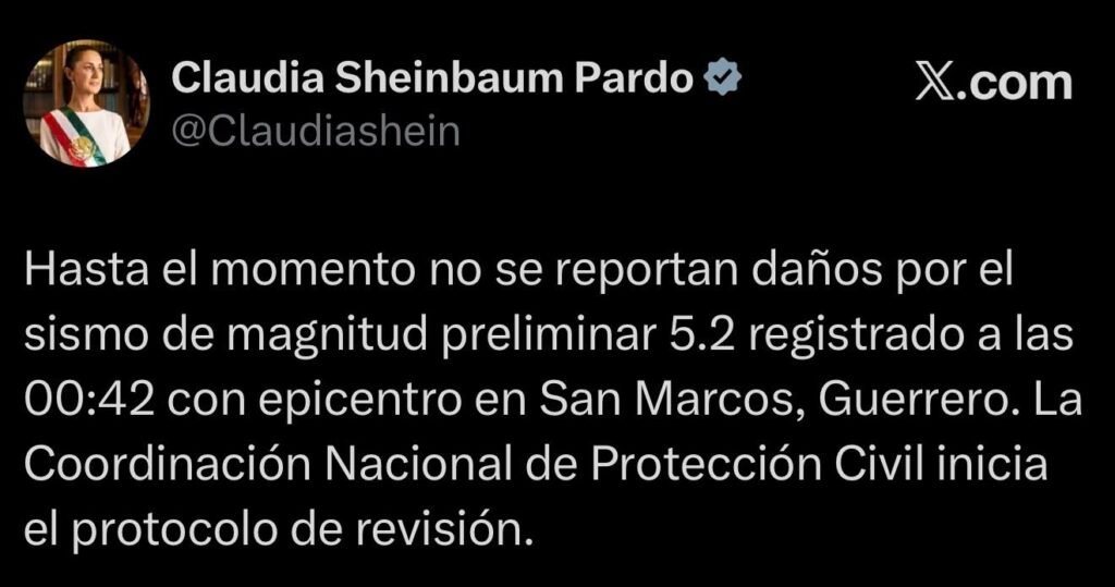 A través de redes sociales, la presidenta Claudia Sheinbaum Pardo informó que hasta el momento no hay reporte de daños por el sismo de magnitud preliminar 5.2 registrado a las 00:42 con epicentro en San Marcos, Guerrero.
