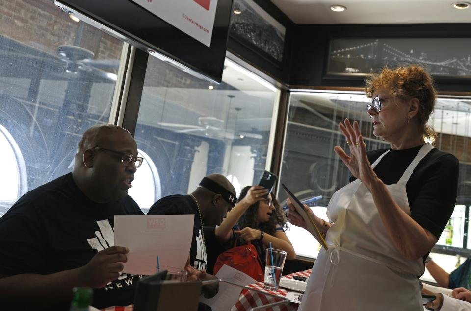 Sarandon, con un delantal con el logo de la ONG, el cabello recogido y gafas, bromeó ante los comensales: “Estoy feliz de estar aquí y que no me detengan”, recordando lo ocurrido hace un año, cuando protestaba en el Capitolio de Nueva York por un mayor sustento para los trabajadores que dependen en buena parte de propinas.